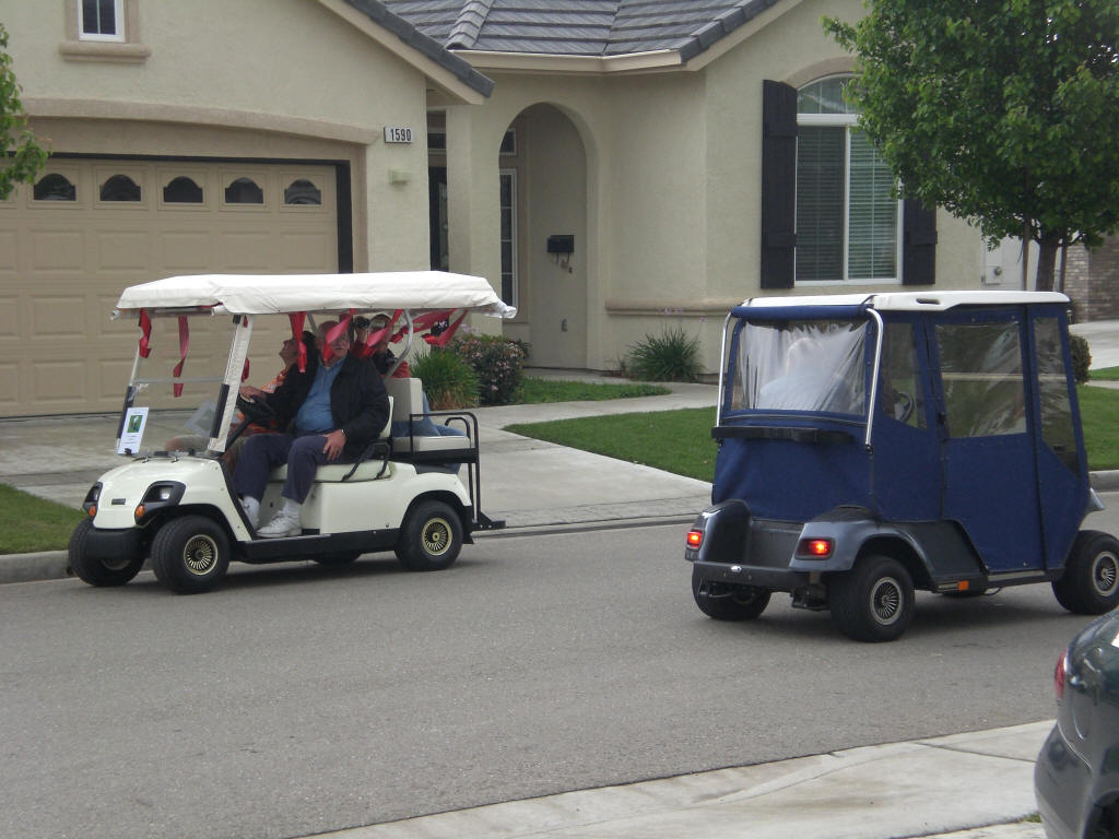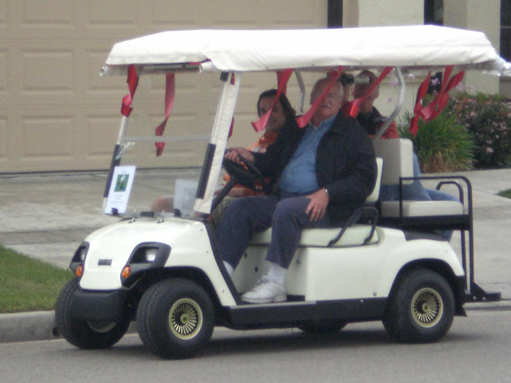 This year, 2007, Leo turned 70. Mark, Katie, Christine and myself thought it would be more than fun to give him something he'd never buy for himself. Something fun for the sake of being fun. What to get for a guy who lives on a golf-course who doesn't golf? A new golf-cart of course! Mark and Katie were up North to help us celebrate his birthday and to help present the cart. Thanks to Pat for letting us use her garage to hide the present for a night. When they left to go pick up Mark and Katie, Chris and I ran down to Pat's and picked up the cart. We then backed it into the garage and put some ribbons on it and waited. And waited.... Finally the rattle and clacking of the garage door opening told us it was time for action. I whipped open the video recorder and fired it up just in time to see them pull up expecting to park in the garage only to find out some rude person had parked in the garage. Wait..what's that...bows? Ribbons? What's going on here?!!! Alexis put on her best smile while Mark and Katie hopped out of the car to join us in a round of 'Happy Birthday. Needless to say he was pretty blown away. My mother was also in the dark about this whole project so it gave the whole planning phase a bit more spice. She appeared shocked as well. Enjoy the photos, Eric